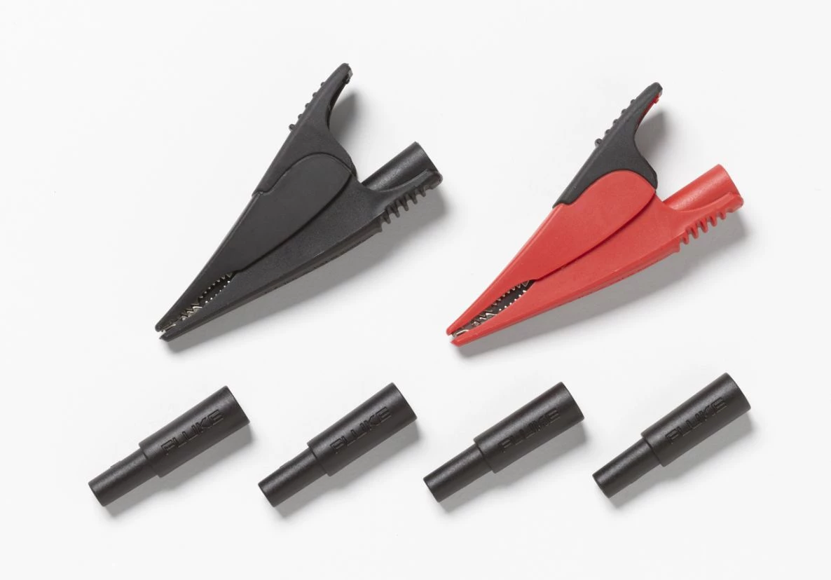 - Une paire de grandes pinces crocodiles AC285 (rouge, noir) avec des mâchoires en acier nickelé plus 4 adaptateurs pour les sondes à fusibles Fluke