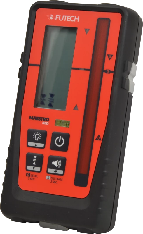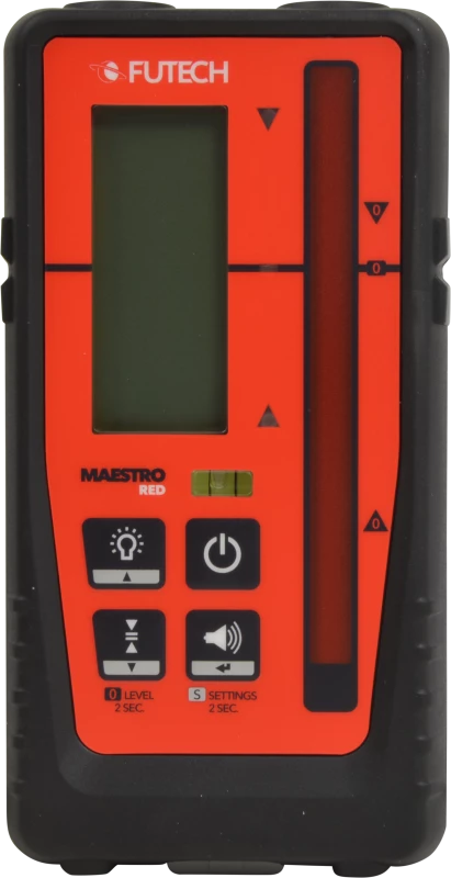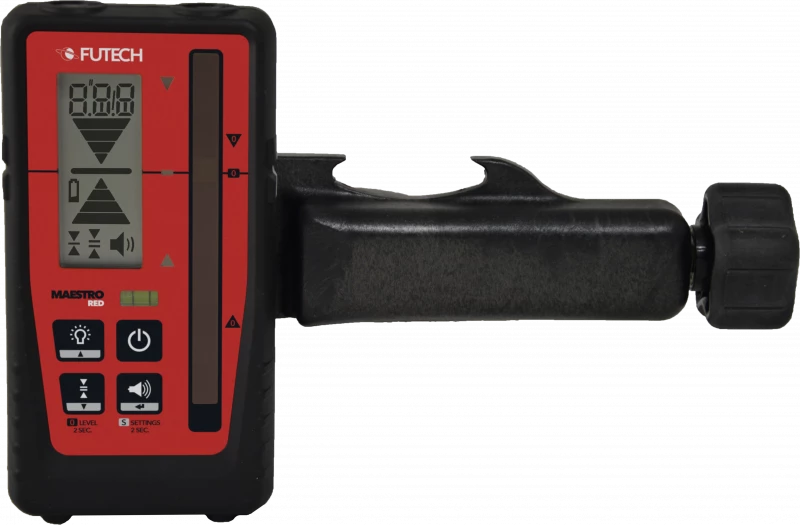 Récepteur avec indication des mm pour les lasers à rotation rouge avec une portée de 400m. Zone de réception de 90 mm et indications sur l’écran LCD (à l’avant et à l’arrière de l’appareil), les LED (à l’avant) et les signaux sonores. Fourni avec une pince.
